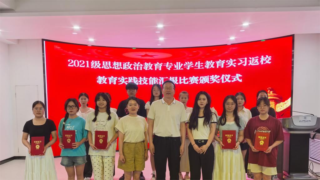 2021级思想政治教育专业学生教育实习返校后,pp电子官方网站入口精心安排,组织学生交流经验、分享体会,举行了教育实习生返校教学技能汇报选拔赛初赛和决赛,共有17名教学技能优秀同学获奖,其中一等奖4人(龙晓凤 孙睿 程靖雯 胡欣萍);二等奖6人(董春燕 田芸菲 李彦虎 史梦婷 陈焕焕 胡岚);三等奖7人(成雪 朱文惠 贾勐 蒲蕊 任向飞 陈文豪 林佳颖)。学院对获奖同学颁发了荣誉证书及奖品,以资鼓励。