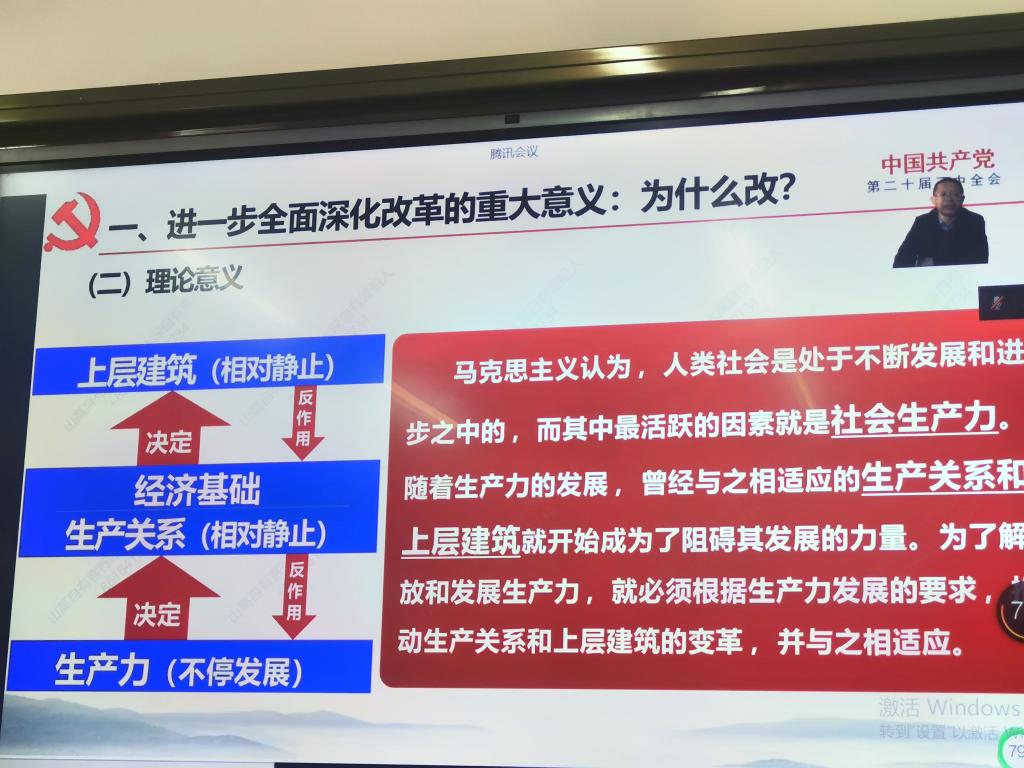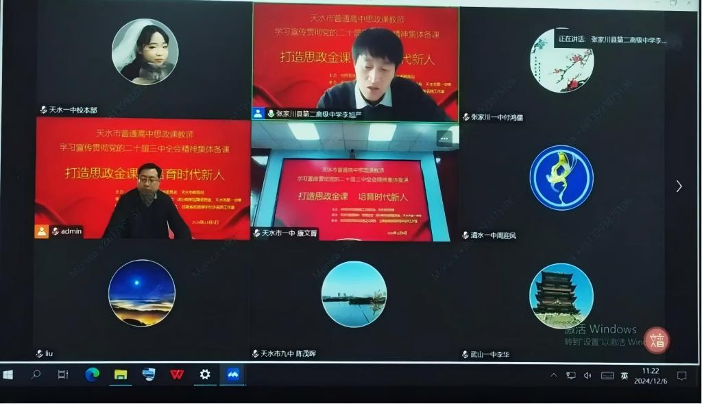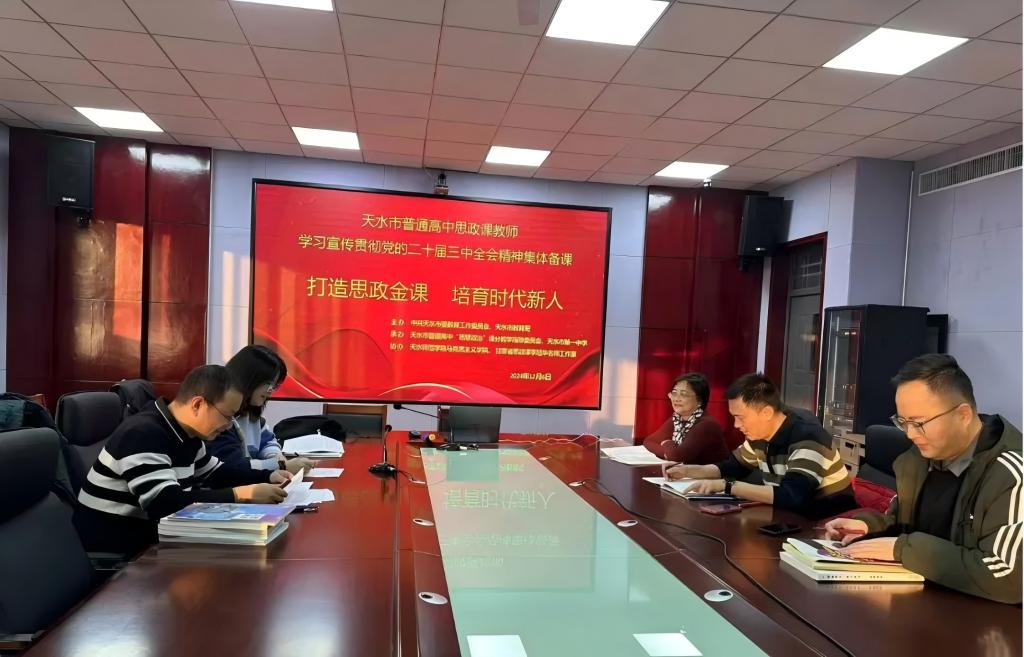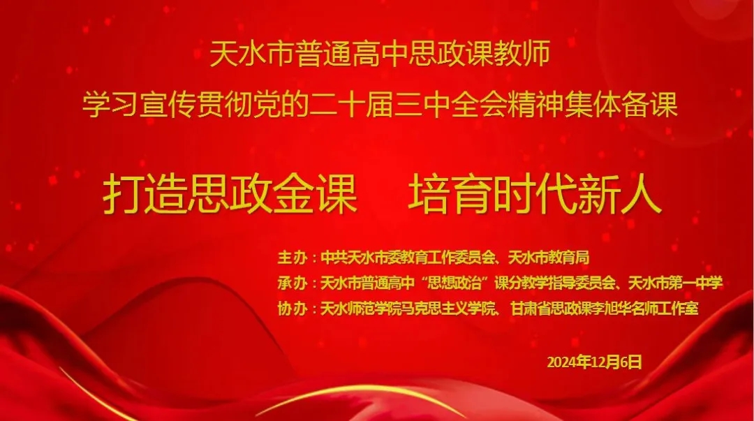 为深入学习宣传贯彻党的二十届三中全会精神,全面落实全国教育大会精神,推进天水市大中小学思政课一体化建设,12月6日上午,天水市普通高中思想政治课教师开展了学习宣传贯彻党的二十届三中全会精神集体备课会。会议由中共天水市委教育工作委员会、天水市教育局主办,天水市普通高中“思想政治”课分教学指导委员会、天水市第一中学承办,天水师范学院pp电子官方网站入口与甘肃省思政课李旭华名师工作室协办,会议由天水市普通高中“思想政治”课分教学指导委员会主任、天水市一中副校长宋劼主持。会议主题是“打造思政金课,培育时代新人”,采用腾讯会议在线直播形式进行,天水市第一中学思政课教师线下参会,其他学校设立分会场组织思政课教师线上线下结合参会,全市共计三百余名普通高中思政课教师参会。