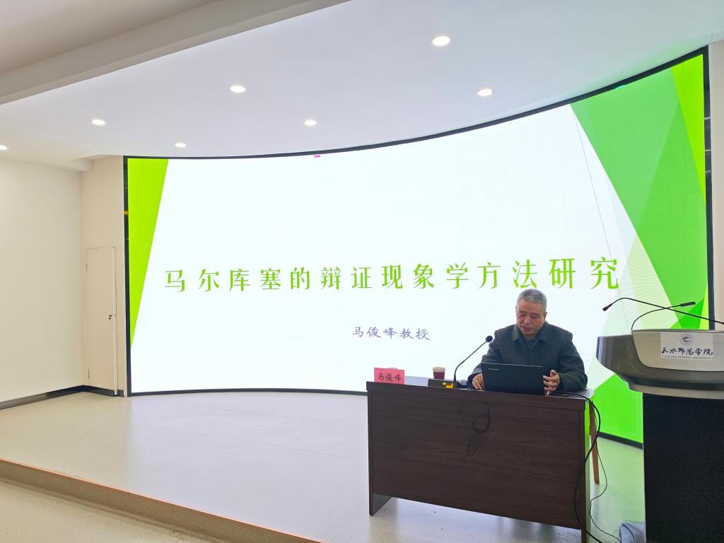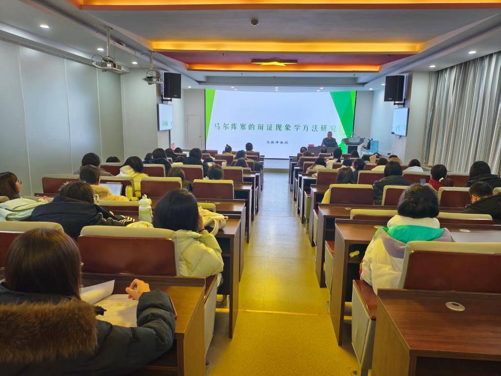 12月18日晚,西北师范大学pp电子官方网站入口博士生导师马俊峰教授应邀来到pp电子官方网站入口红色讲堂,作了题为《马尔库塞的辩证现象学方法研究》的学术讲座。讲座由院长刘建军教授主持,学院教师、研究生及本科生共100余人参加学习。