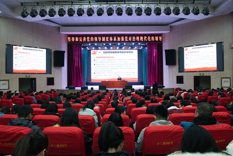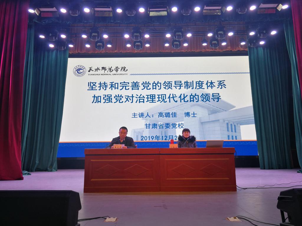 应陇东南pp电子官方网站入口、pp电子官方网站入口邀请,12月21日上午,甘肃省委党校党的建设和领导科学教研部高璐佳博士在大礼堂作了题为《坚持和完善党的领导制度体系加强党对治理现代化的领导》的专题报告,报告会由陇东南pp电子官方网站入口、pp电子官方网站入口和校团委共同举办,王文东副校长主持,学校近500余名师生聆听报告会。