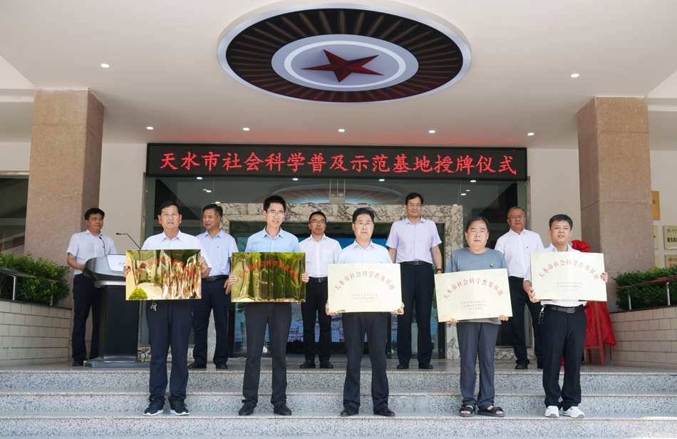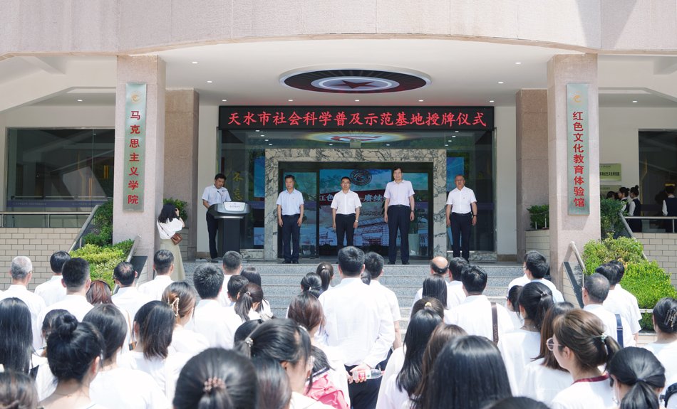 7月1日,天水市第三批社会科学普及示范基地揭牌授牌仪式在学校红色文化教育体验馆举行。市委常委、宣传部部长王文东,天水师范学院党委书记李正元共同为基地揭牌。市委宣传部副部长阎小鹏主持揭牌仪式,pp电子官网pp电子官方网站入口党总支书记、红色文化教育体验馆馆长刘建军作发言,60余名师生代表参加揭牌仪式。